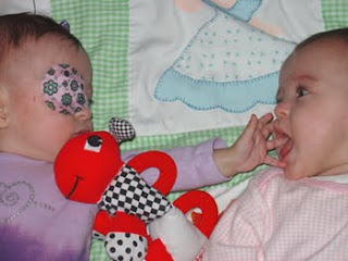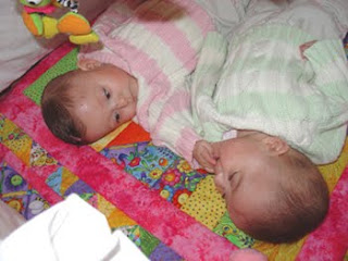 The girls turned 6 months old, in age adjusted terms, on Tuesday the 17th. I thought it would be good to write a little about their personalities and development thus far, so we can look back on this someday and remember what they were like. Holland now weighs 13 pounds 2.5 ounces. She has lots of dark hair wth blonde highlights on the top of her head, but not so much on the back. She is able to roll over really well now, and can pick up her head to look at her toys when on her belly. She is also sitting up with just a little support, and likes to spend time in her walker or booster seat practicing her skills. She really likes to kick things and is good at aiming her feet, whether it be to kick her toys to make them move, or to kick her sister in the head:) She also LOVES to be talked to and sang to. She laughs out loud when I bounce her on my lap and sing, and when I scare her and say "hey" in a stern voice. She holds her toys and puts them in her mouth, but doesn't really reach for them yet. She does reach for her sissy's mouth though! Holland is a great sleeper and eater. She drinks about 25 ounces of milk in 24 hrs, and usually only wakes up once during the night to eat, if at all. She generally takes 3 naps a day, one long morning nap and two shorter afternoon and early evening naps.