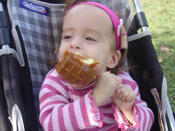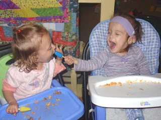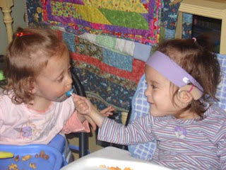 I go through many ups and downs in any given week. In any given day really. This week I am feeling very down again thinking about the difficulties that Eden will face in learning to communicate. The speech therapist talked a lot about getting Eden started on some sort of augmentative communication system. At this age, it would be some sort of picture exchange system, moving to a computer as she gets older. This therapist thinks that Eden will learn to talk, and will be able to speak in sentences to us at home. She thinks that Eden is going to need support in talking in a group setting or when giving any sort of presentation in school or at work when she gets older. Becaue of her poor trunk support and breath control issues, she has a hard time projecting her voice and tends to be very quiet. In the future, she will likely have trouble maintaining control of her voice long enough to carry on lengthy conversations.