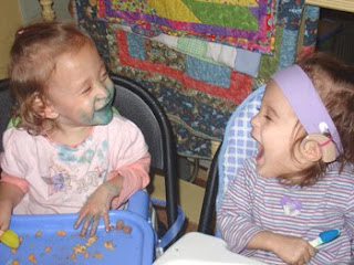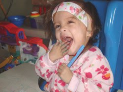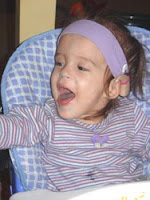 Eden's expressive language is not coming along as well as I had hoped and envisioned when she got her implant. This is not due to her hearing at all. Her newest audiogram shows that she is hearing all of the sounds necessary for speech development, and her hearing is essentially in the normal range. The difficulties that she is having with expressive language are due to the Cerebral Palsy. Often times, children with severe CP are not able to talk because of poor oral-motor control. They are not able to control the muscles of the face to allow them to form words. This is not Eden's problem. She has fairly good oral-motor skills. She is able to easily move food around in her mouth, swallow, and uses her lips and tongue very well. Her difficulties are all related to poor trunk control and lack of adequate breath support. I had no idea how much her low trunk tone would affect her language development.