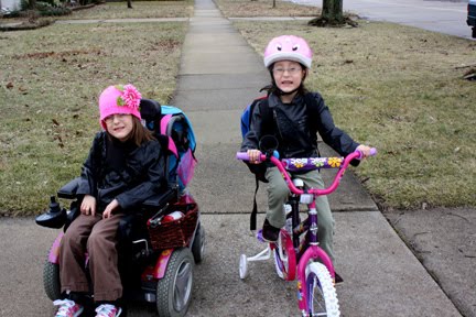 Eden got a new manual wheelchair, a Zippie Zone...in pink of course. It took 6 months to complete the process, but it was fully covered between our private insurance and CSHC. We haven't had a whole lot of time to practice using it yet, but she is already pretty good at pushing and steering it. Our long-term goal is that she will continue to use her power chair when we are outdoors or for longer distances, but will use the manual chair in smaller settings (like at school). So far, we are happy with it. Eden sits well in it and it is pretty easy for her to maneuver. It puts her a eye-level with her peers, and while slightly tall for her now, will eventually be good for her learning to transfer (particularly to the potty) independently. I will post a more thorough review in the future when we have had more of a chance to use it.